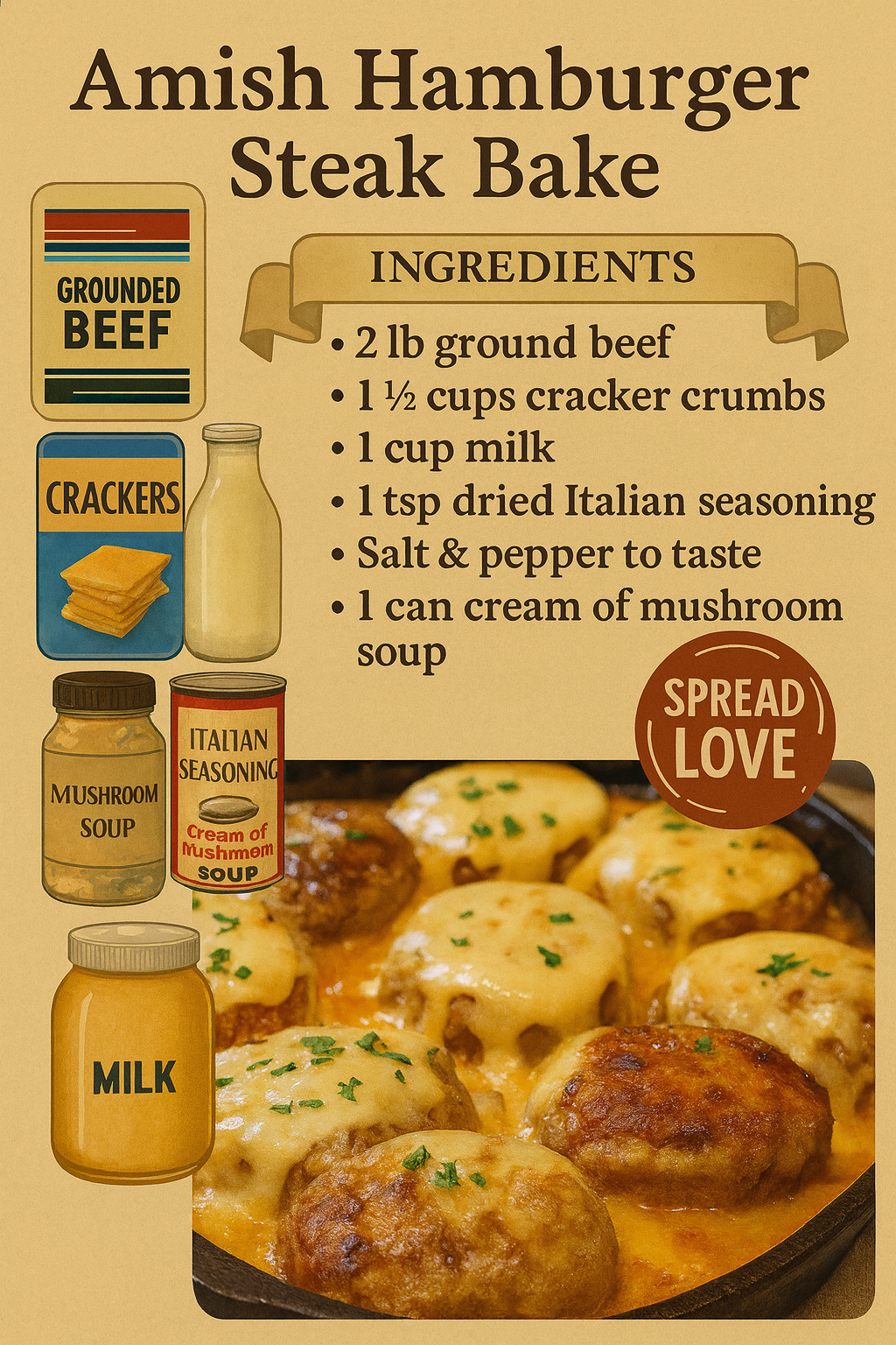 Perfect pick! The Amish Hamburger Steak Bake is one of those old-fashioned, comforting dishes that tastes like home. It combines juicy hamburger steaks, a creamy gravy-like sauce, and layers of hearty flavor all baked together into a cozy meal that’s perfect for weeknights or Sunday dinner.