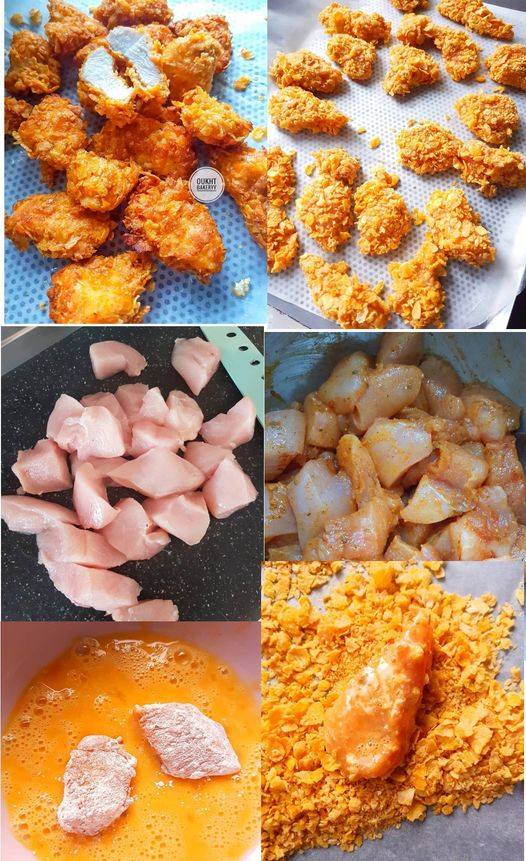 Cooking: Take a piece of chicken out of the marinade, put it in the flour, then in the beaten egg and finally in the cornflakes, pressing a little. Repeat until all ingredients are used up.