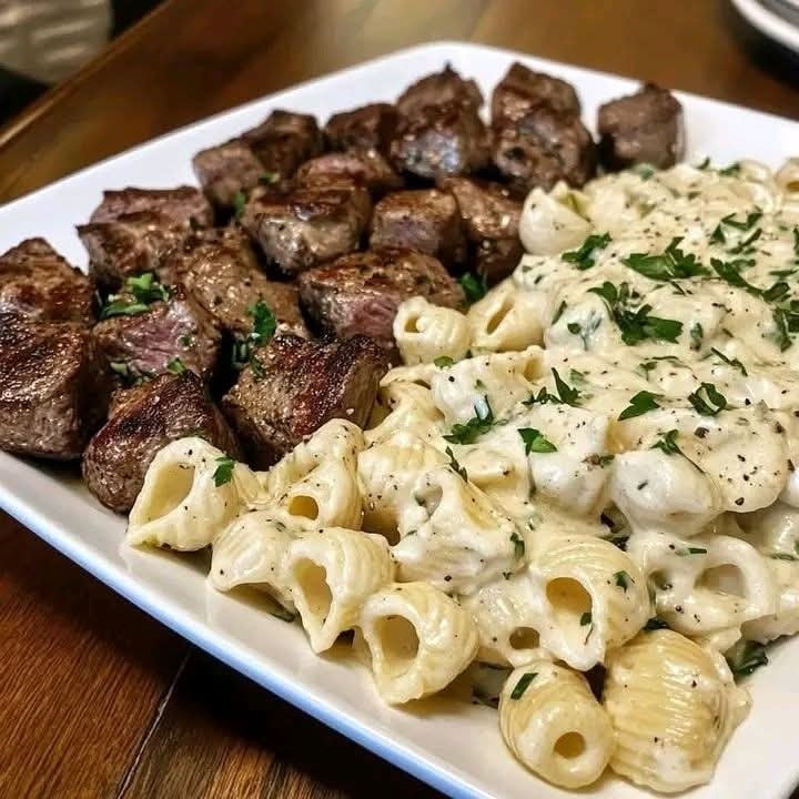 Tender steak bites seared in garlic butter pair perfectly with creamy, cheesy Alfredo shells pasta. This hearty dish combines rich flavors and simple ingredients for a restaurant-quality meal at home.