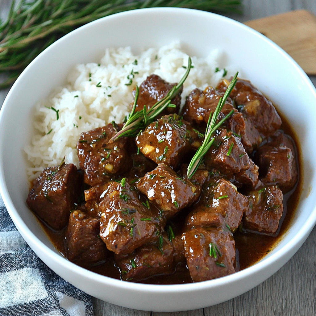Savory beef tips slow-simmered in a garlicky rosemary gravy. Perfect with mashed potatoes or rice.