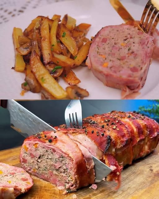 Bake the Meatloaf: Place the meatloaf in the preheated oven and bake for 45-50 minutes, or until the bacon is crispy and the meatloaf is cooked through.