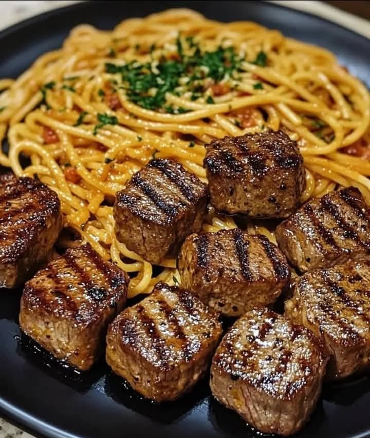 Juicy, tender steak bites seared to perfection in garlic butter and served over a bed of rich, creamy spaghetti. This indulgent dish combines bold flavors and comforting textures—a restaurant-quality meal made easily at home!